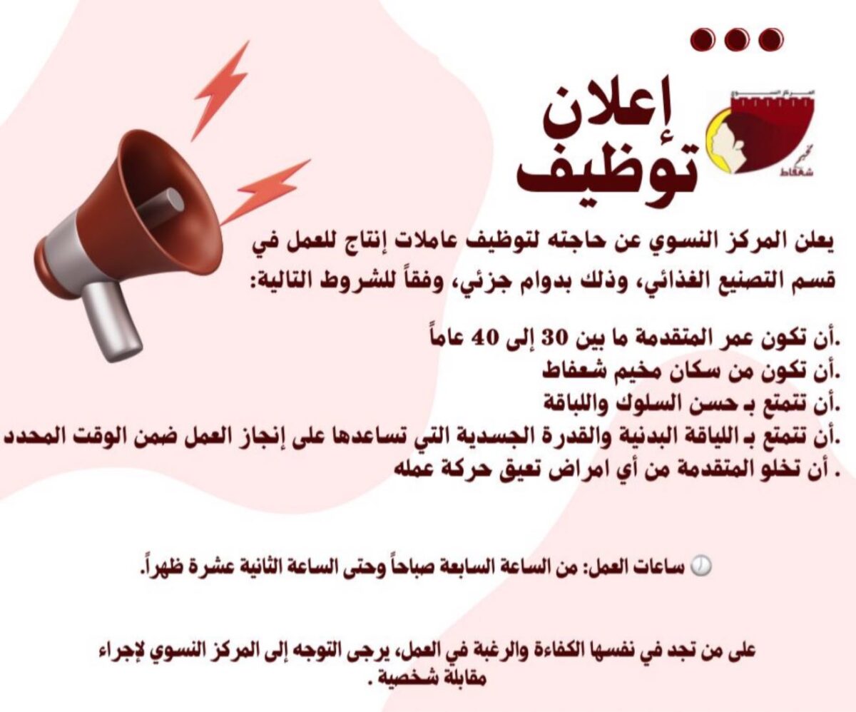 يعلن المركز النسوي لمخيم شعفاط في القدس عن حاجته إلى عاملات إنتاج للعمل في قسم التصنيع الغذائي لعام 2025 بدوام جزئي.
