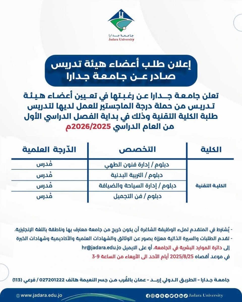 تعلن جامعة جدارا في مدينة إربد – الأردن عن حاجتها إلى أعضاء هيئة تدريس من حملة درجة الماجستير للعمل في الكلية التقنية، وذلك مع بداية الفصل الدراسي الأول للعام الأكاديمي 2025/2026م.