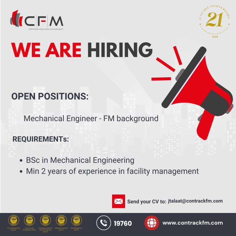 تعلن شركة CFM – Contrack Facilities Management عن حاجتها لتعيين مهندس ميكانيك للعمل ضمن فريق إدارة المرافق (FM) لديها في الإمارات.