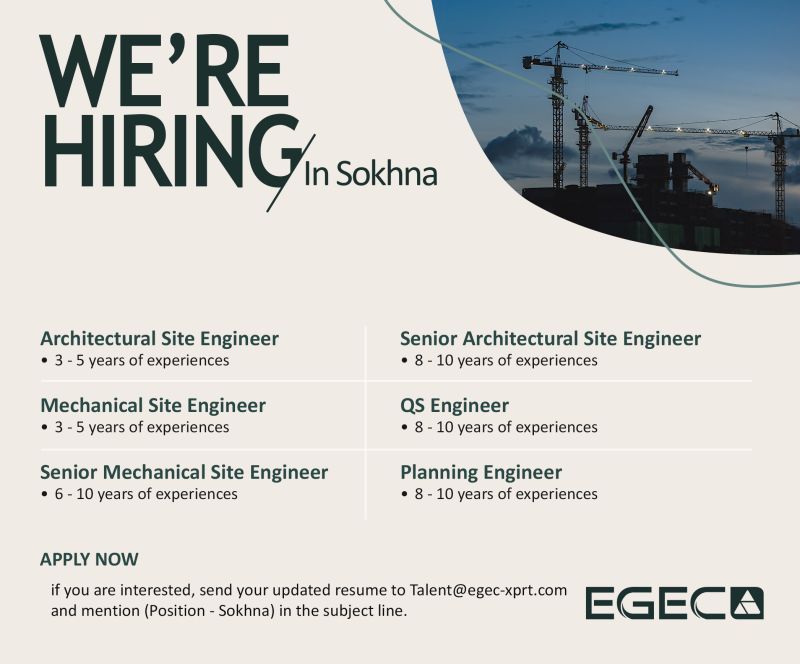 تعلن شركة EGECA عن فتح باب التوظيف لعدة تخصصات هندسية في منطقة السخنة، مصر، لعام 2025. يُشترط الخبرة السابقة حسب كل تخصص، ويُفضل إرسال السيرة الذاتية فورًا لضمان التقييم المبكر.