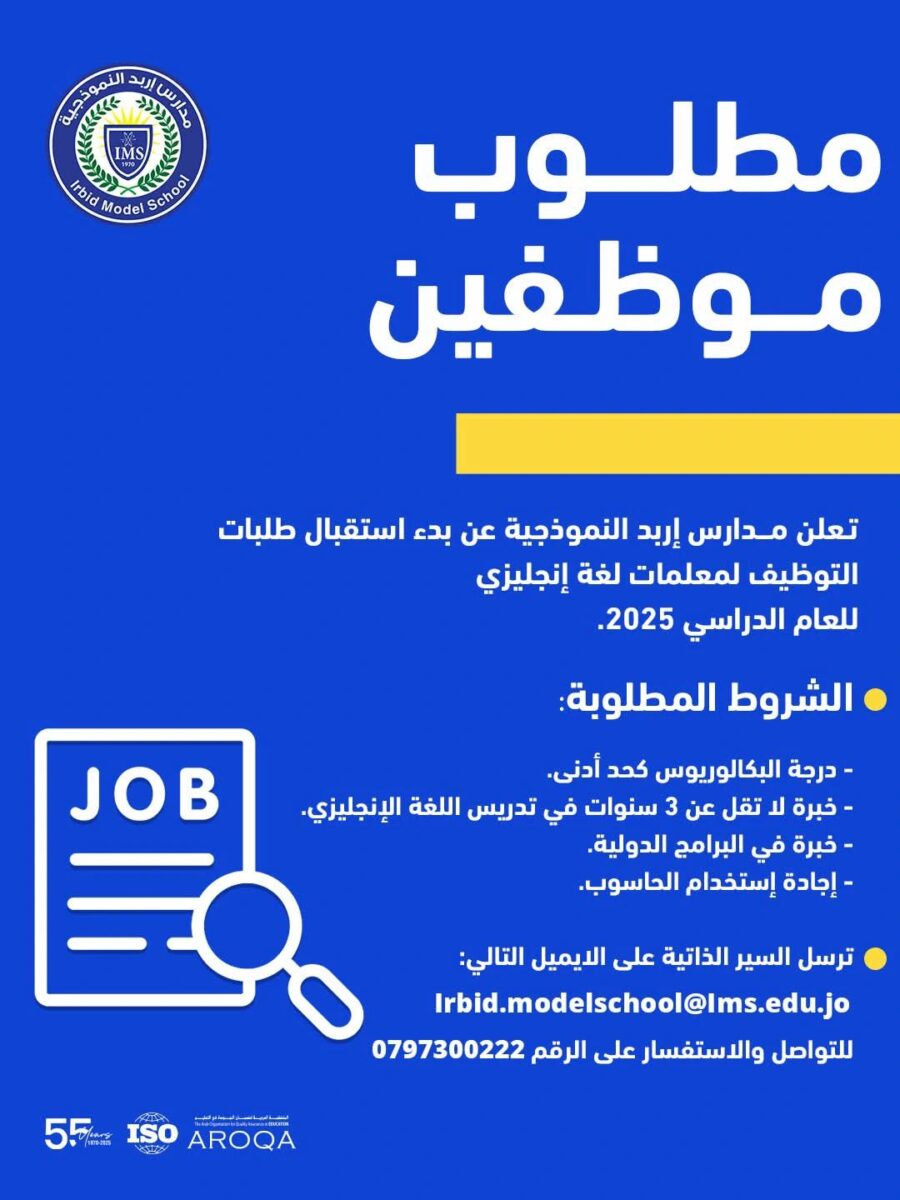 تُعلن مدارس إربد النموذجية عن حاجتها لتعيين معلمات لغة إنجليزية للعام الدراسي 2025، ضمن كوادر تعليمية متميزة.