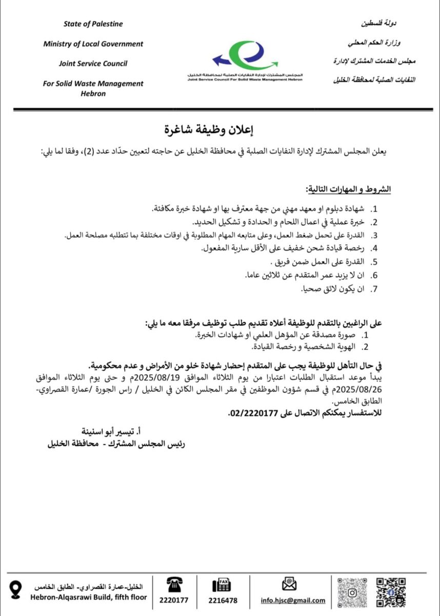 على الراغبين بالوظيفة الحضور شخصيًا إلى قسم شؤون الموظفين في مقر المجلس المشترك لإدارة النفايات الصلبة – الخليل.