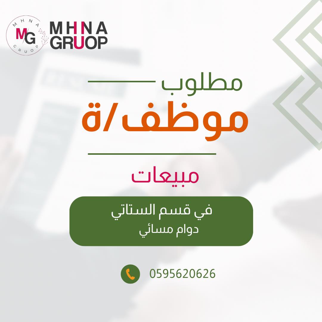 تعلن مجموعة مهنا جروب عن حاجتها لتعيين موظف/ة مبيعات للعمل في قسم الستاتي بدوام مسائي داخل فروع الشركة.