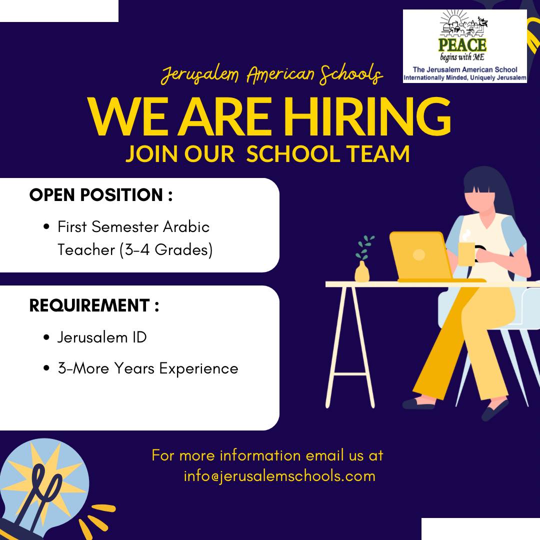 تعلن مدرسة القدس الأمريكية عن حاجتها لتعيين مدرس/ة لغة عربية للصفوف 3–4 للفصل الدراسي الأول 2025.