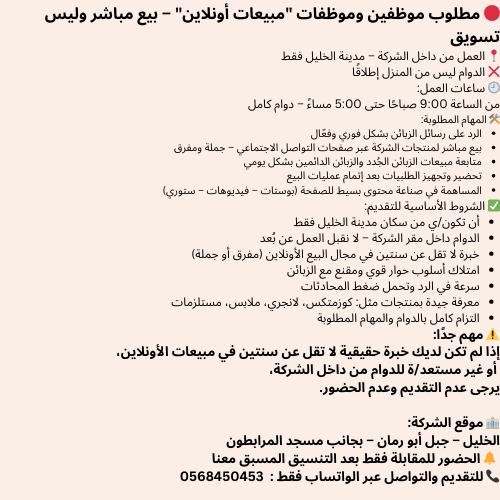 ✅ خبرة عملية لا تقل عن سنتين في مبيعات الأونلاين (شرط أساسي)