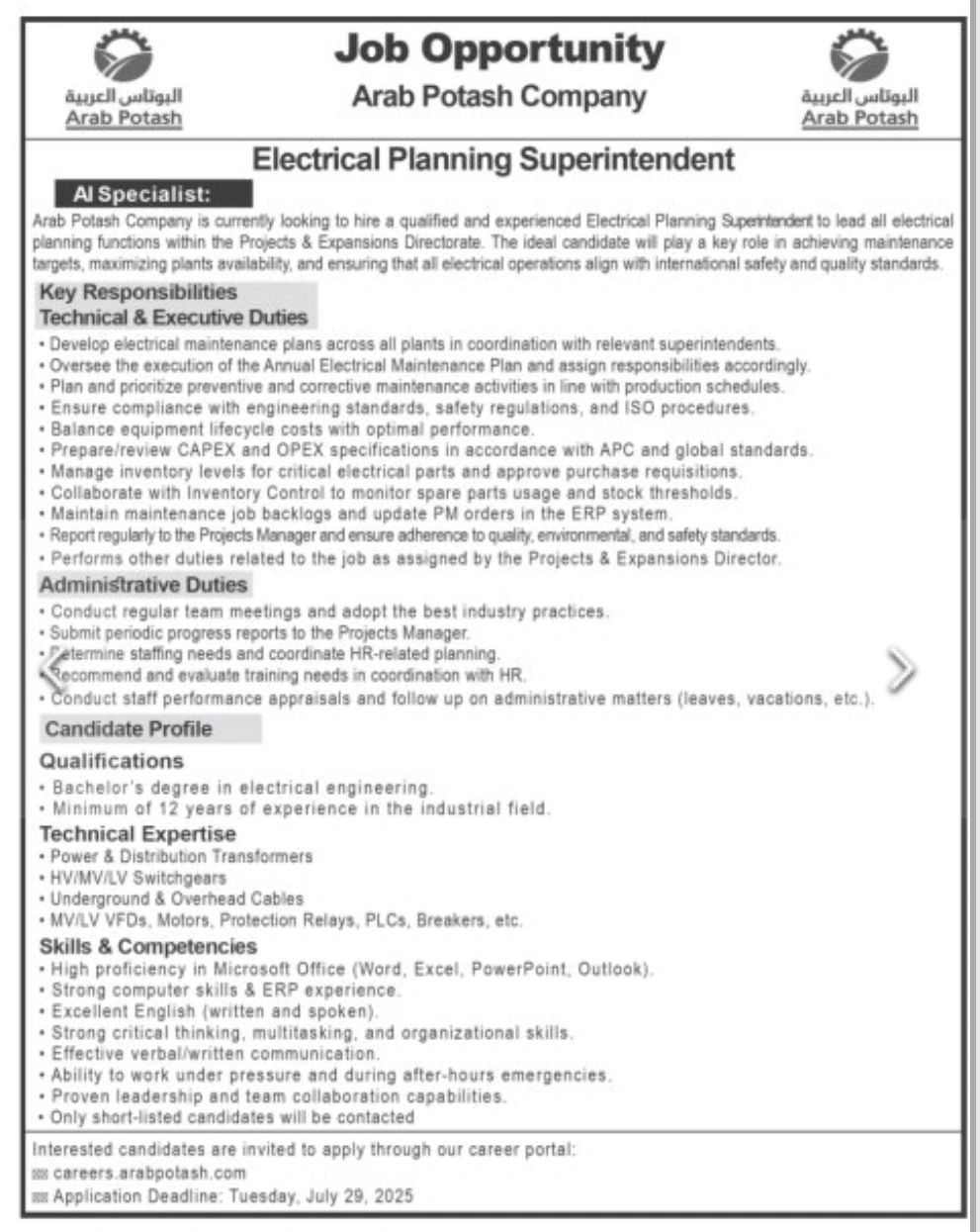تعلن شركة البوتاس العربية عن حاجتها لتعيين Electrical Planning Superintendent للعمل في مجال التخطيط الكهربائي ضمن مديرية المشاريع والتوسعات في الأردن.