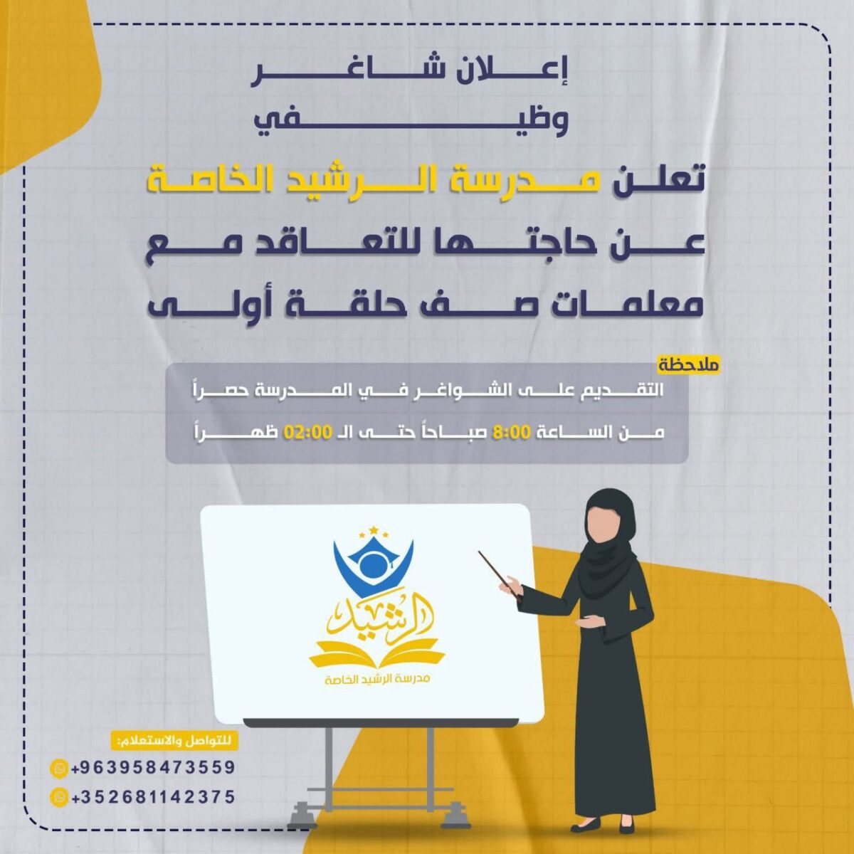 تعلن مدرسة الرشيد الخاصة عن حاجتها للتعاقد مع معلمات صف حلقة أولى للعام الدراسي 2025.