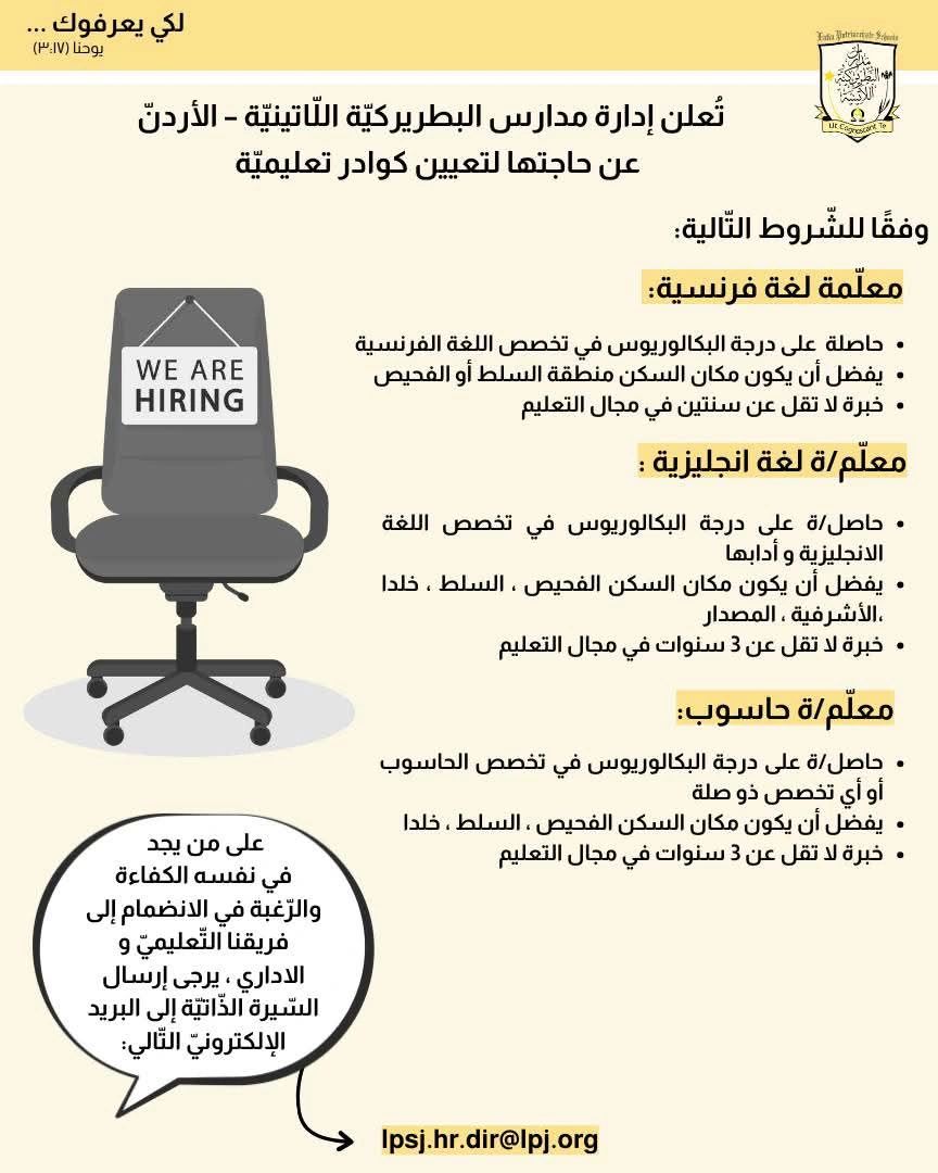 تعلن مدارس البطريركية اللاتينية في الأردن عن وظائف شاغرة لعام 2025.