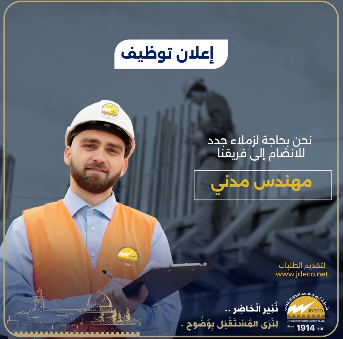 تُعلن شركة كهرباء محافظة القدس عن حاجتها لتعيين مهندس/ة مدني ضمن كوادرها الهندسية في منطقة القدس وامتياز الشركة.
