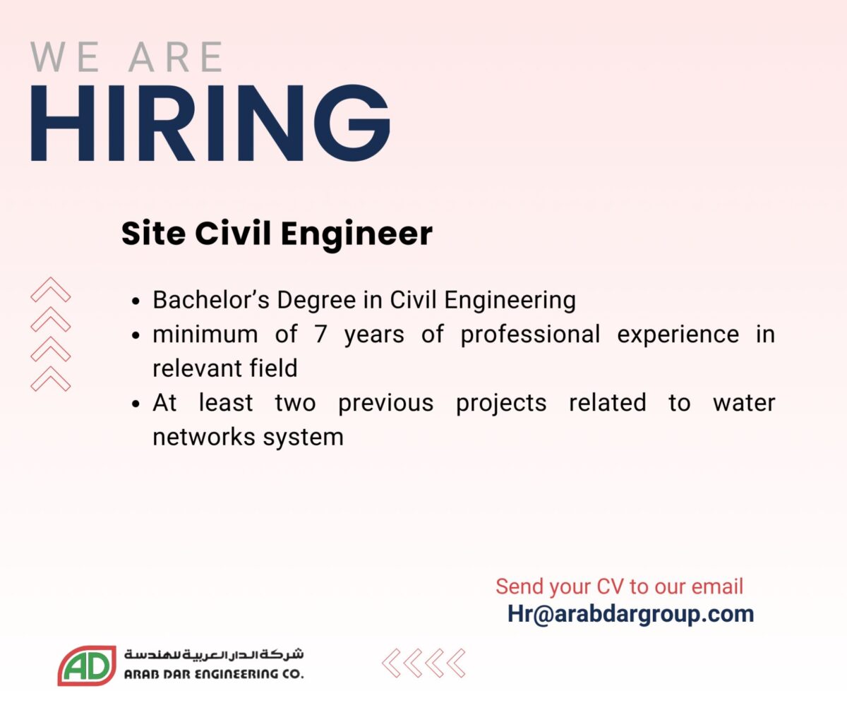 تعلن شركة عرب دار للهندسة عن توفر فرصة توظيف فورية لوظيفة مهندس مدني موقع في عمان، الأردن، وذلك ضمن مشاريع متميزة في قطاع شبكات المياه.