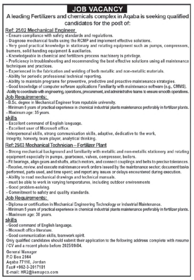 تعلن شركة كيمابكو (Kemapco) – مجمع الأسمدة والكيماويات في العقبة، الأردن عن توفر فرص عمل للعام 2025 في التخصصات التالية: