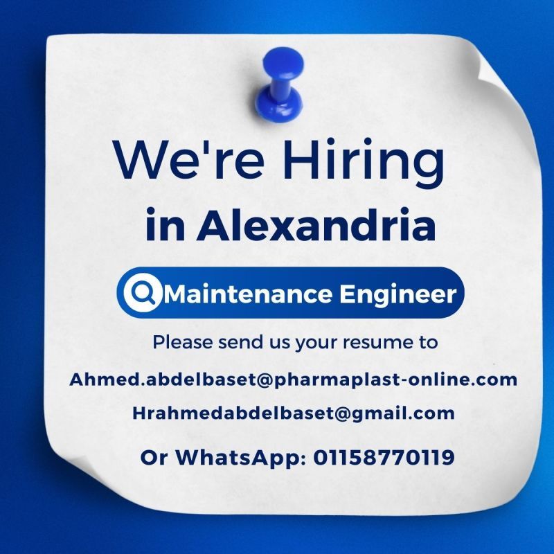 تُعلن شركة صناعية رائدة في مدينة الإسكندرية عن حاجتها لتعيين مهندس صيانة (Maintenance Engineer) للانضمام إلى فريقها التقني.
