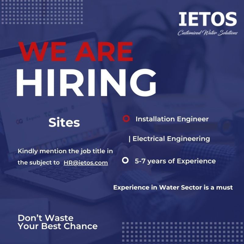 تُعلن شركة IETOS – Customized Water Solutions عن حاجتها لتعيين مهندس تركيب (Installation Engineer) للعمل في مواقعها الميدانية ضمن مشاريعها في قطاع المياه.