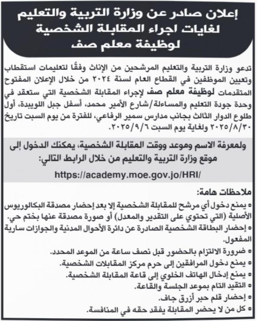تدعو وزارة التربية والتعليم الأردنية المرشحات من الإناث المتقدمات لوظيفة معلم صف، وفقًا للإعلان المفتوح للتوظيف لعام 2024، لإجراء المقابلات الشخصية وذلك في: