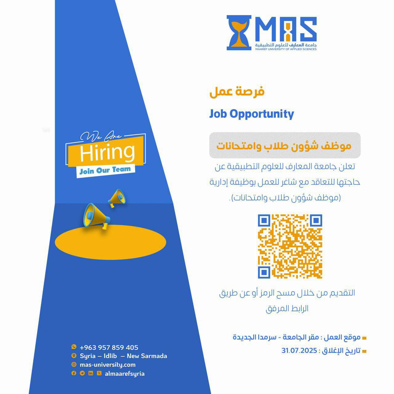 تُعلن جامعة المعارف للعلوم التطبيقية عن رغبتها بالتعاقد مع كوادر إدارية مؤهلة للعمل ضمن كادرها الإداري في سرمدا الجديدة، وفق التفاصيل التالية: