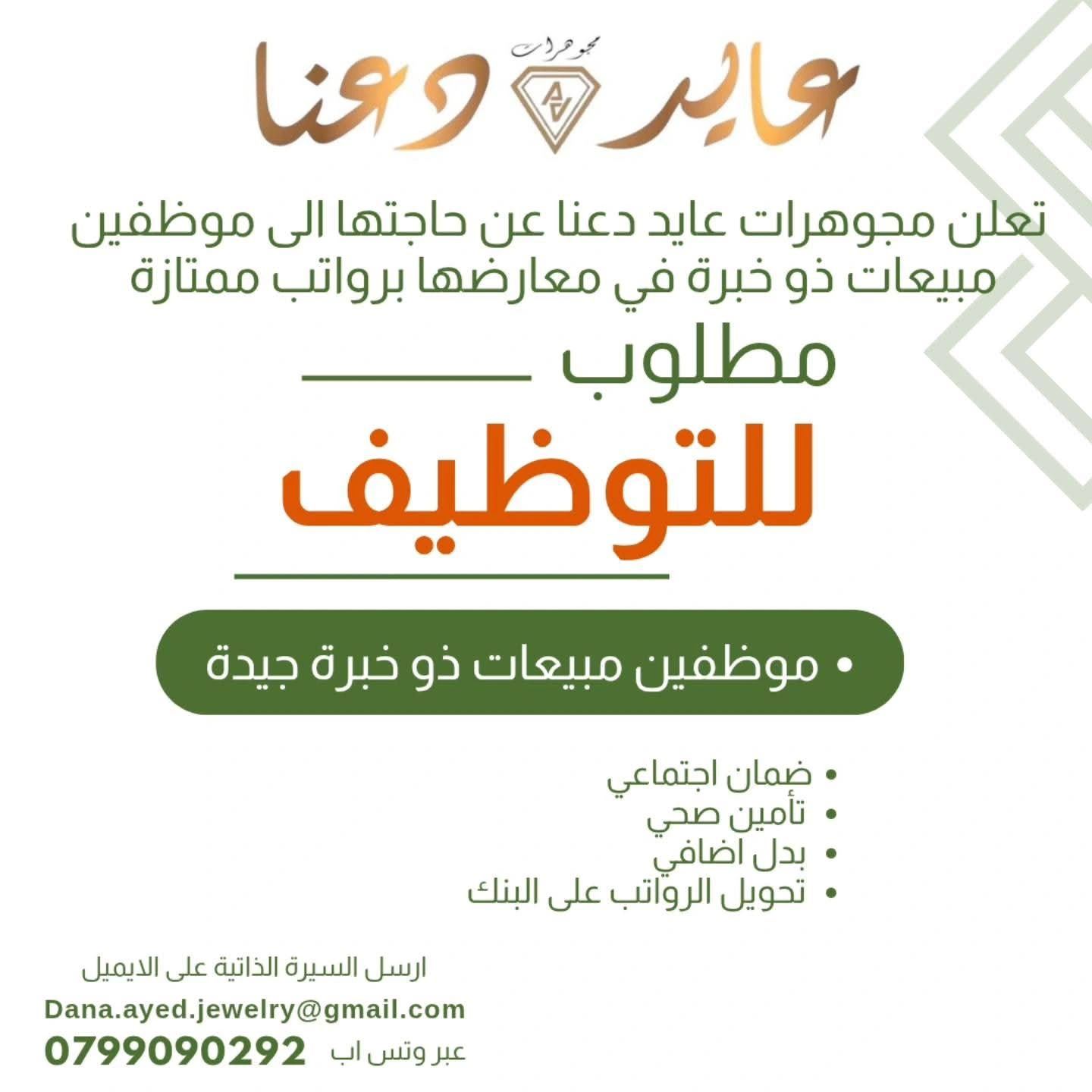 تُعلن مجوهرات عايد دعنا عن حاجتها إلى: