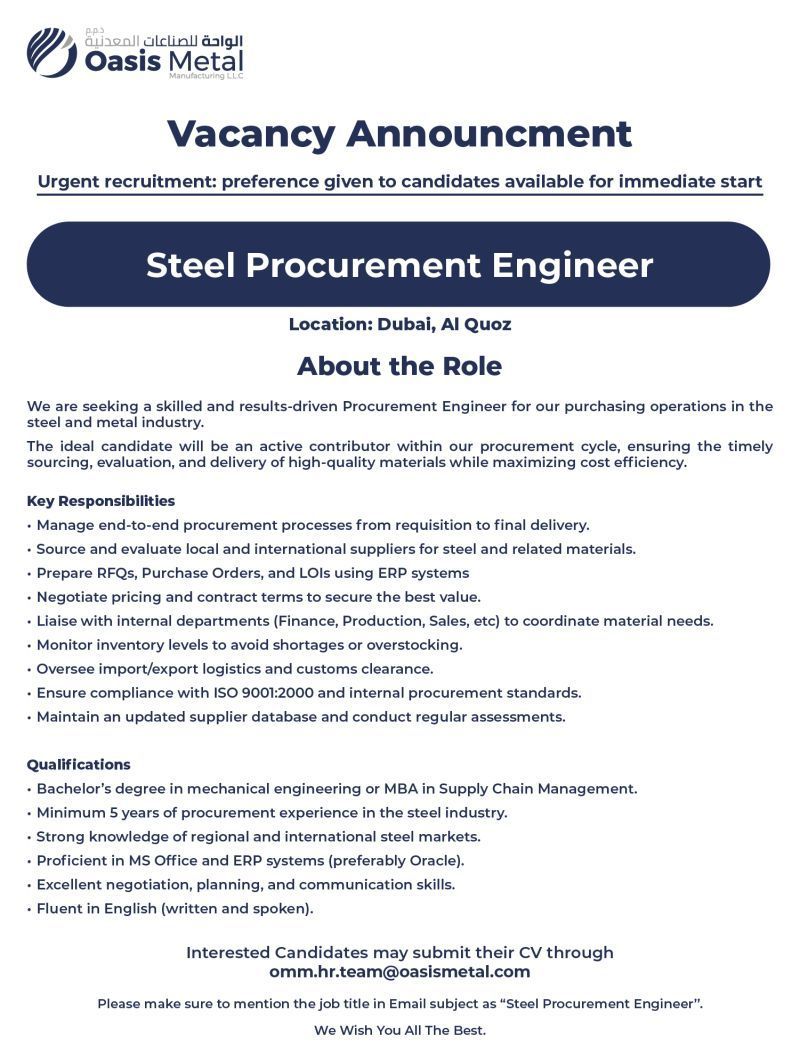 تعلن شركة Oasis Metal Manufacturing LLC في دبي – منطقة القوز عن توفر فرصة وظيفية عاجلة لشغل منصب مهندس مشتريات فولاذ (Steel Procurement Engineer)، مع إعطاء الأفضلية للمتقدمين المتاحين للانضمام الفوري.