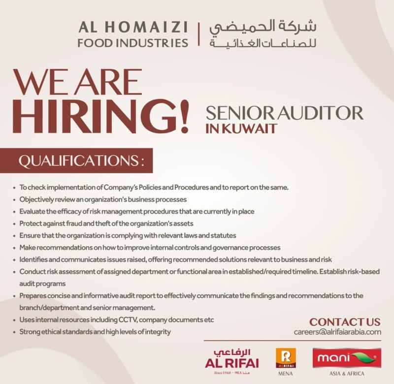تُعلن شركة الحميدي للصناعات الغذائية (Al Homaizi Food Industries) عن توفر وظيفة شاغرة بمسمى مدقق داخلي أول (Senior Auditor) في الكويت للعام 2025، للعمل ضمن فريق التدقيق والمراجعة الداخلية لمجموعة شركات الرفاعي وماني.