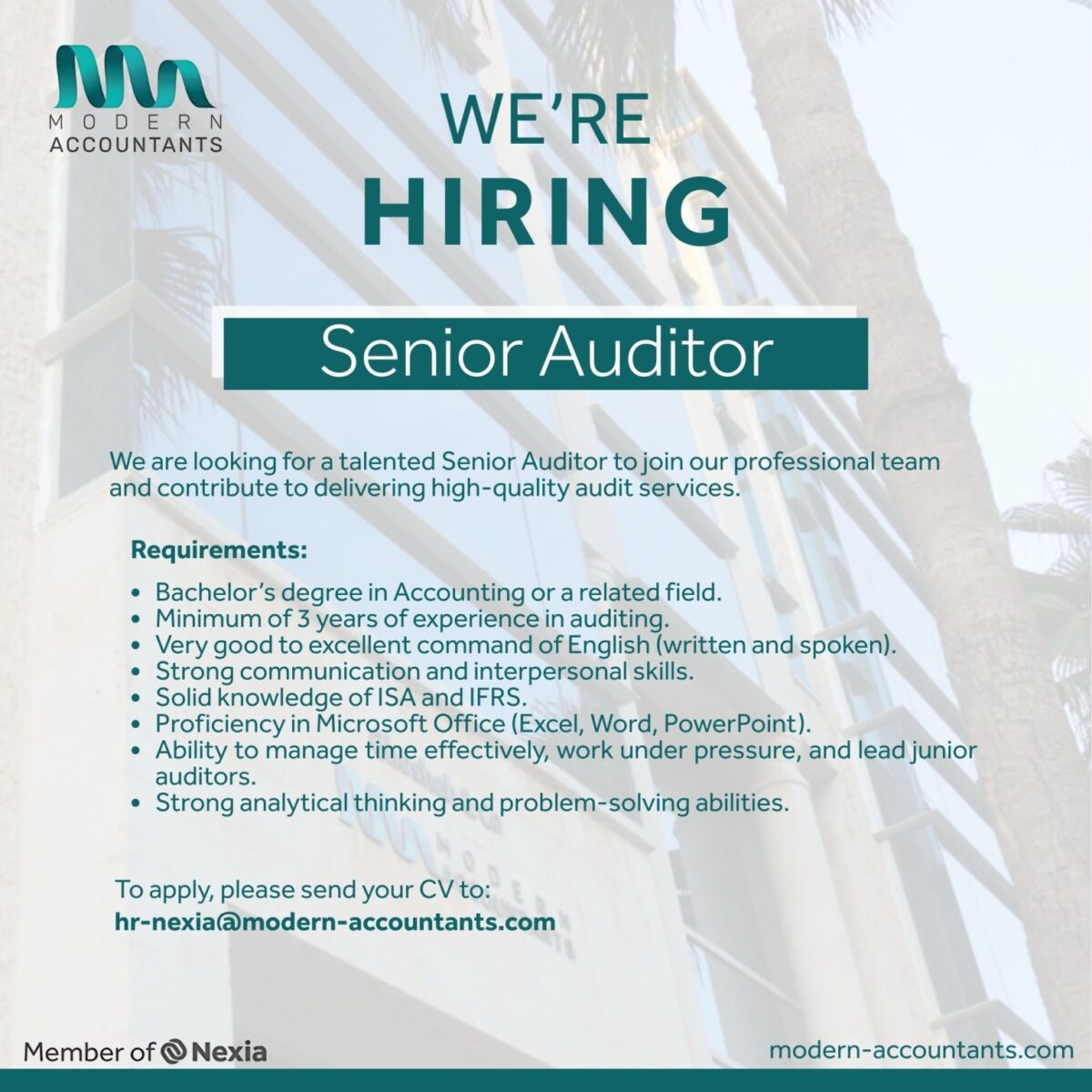 تعلن شركة Modern Accountants – عضو مجموعة Nexia – عن حاجتها لتعيين مدقق أول (Senior Auditor) للانضمام إلى فريقها المتخصص في تقديم خدمات التدقيق عالية الجودة.