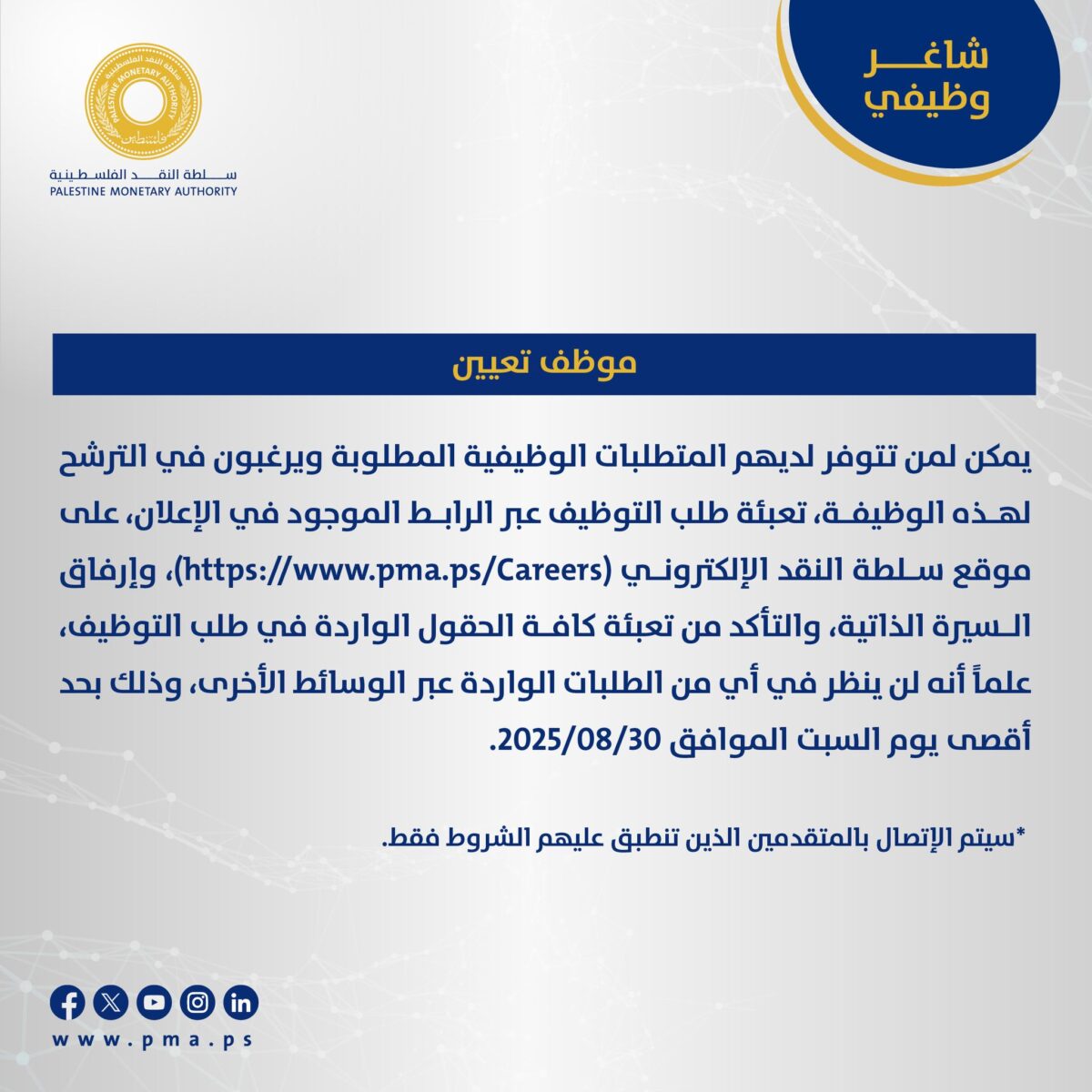 وظائف موظف تعيين – سلطة النقد الفلسطينية 2025
