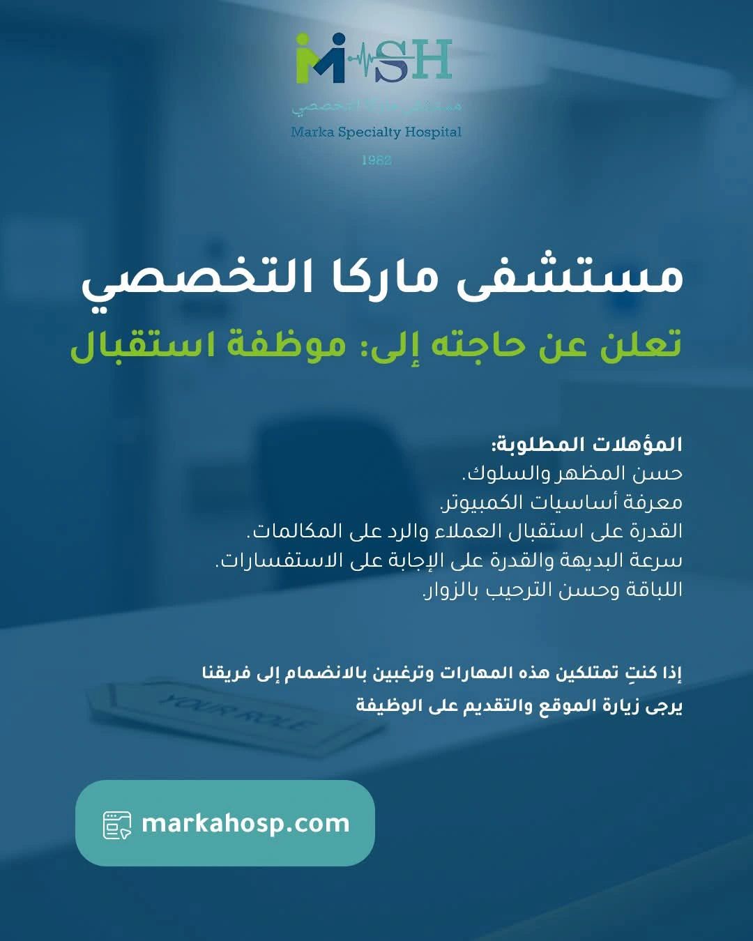 فرص عمل في عمّان 2025 | وظائف استقبال في مستشفى ماركا التخصصي