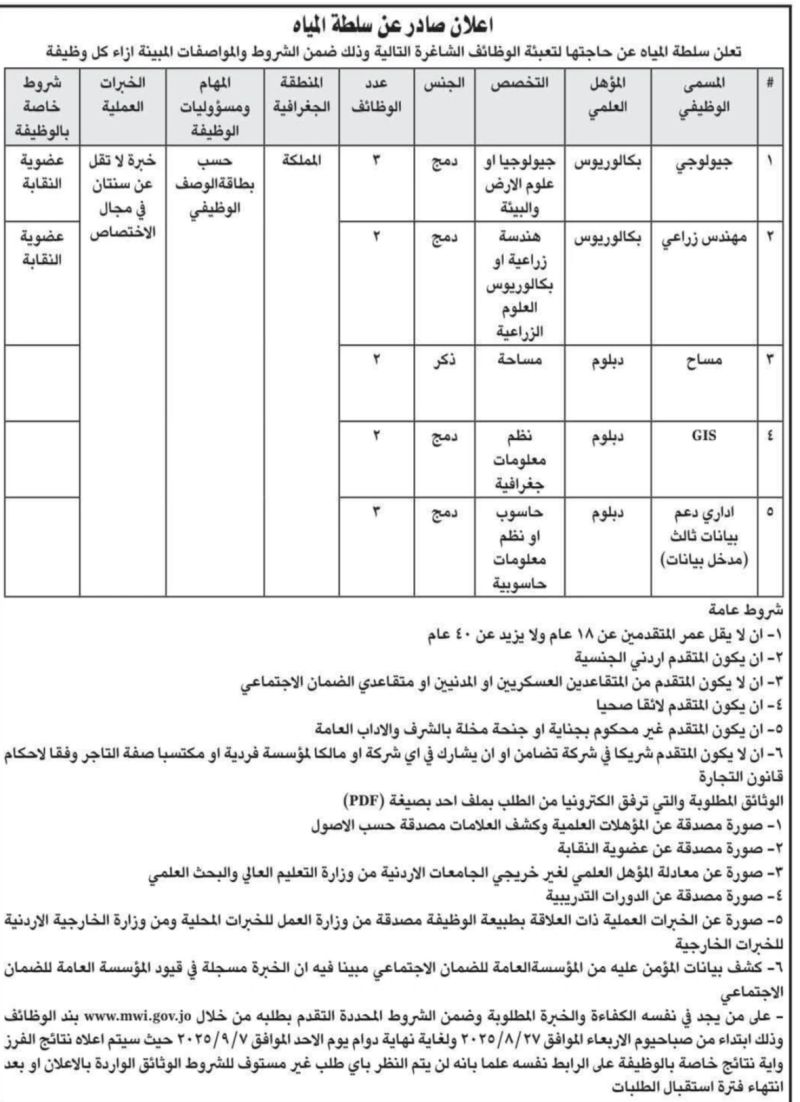 تعلن سلطة المياه الأردنية عن توفر عدد من الوظائف الشاغرة للعام 2025 في مختلف مناطق المملكة، لحملة البكالوريوس والدبلوم، في مجالات متعددة. التفاصيل أدناه: