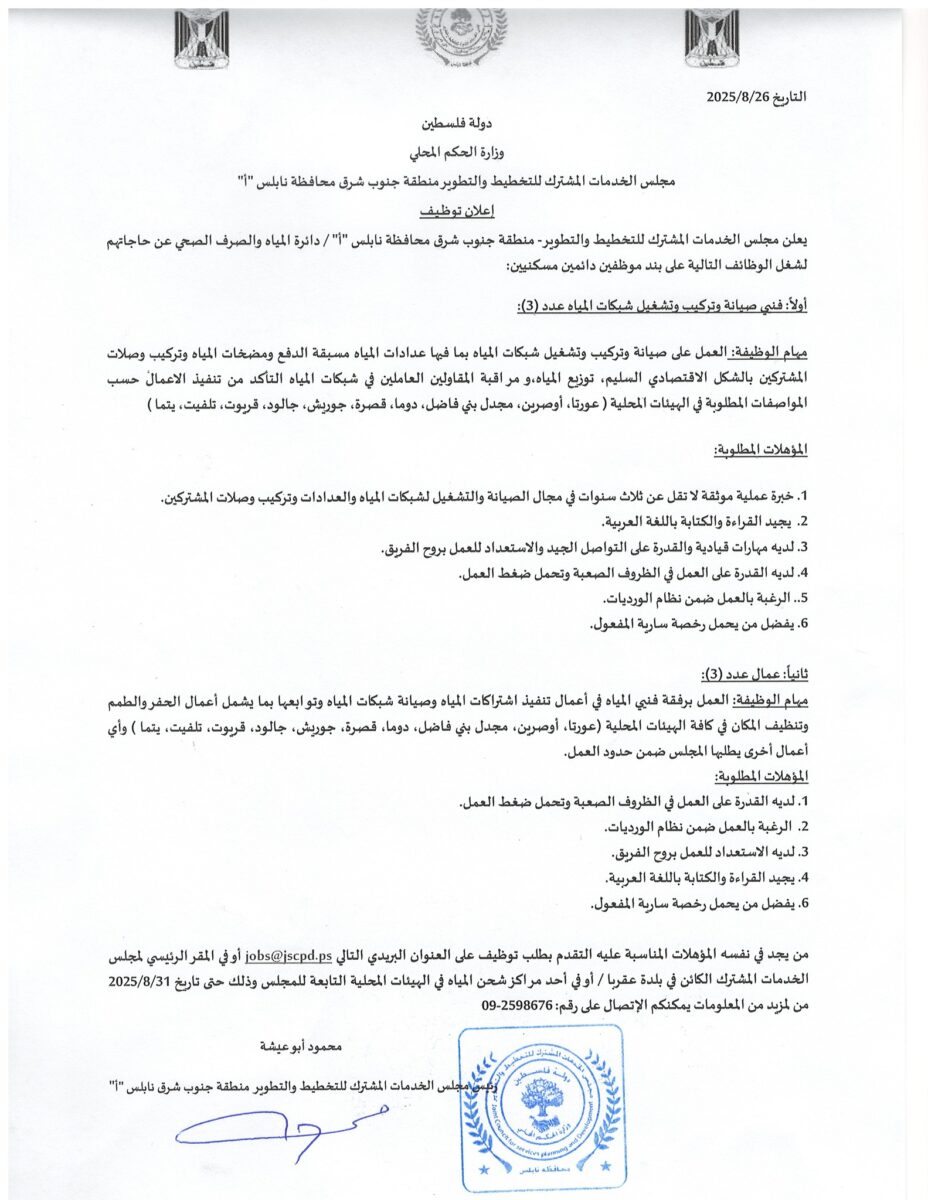 يُعلن مجلس الخدمات المشترك للتخطيط والتطوير – منطقة جنوب شرق محافظة نابلس / دائرة المياه والصرف الصحي عن حاجته لتوظيف عدد من الفنيين والعمال للعمل في مجال المياه والصرف الصحي: