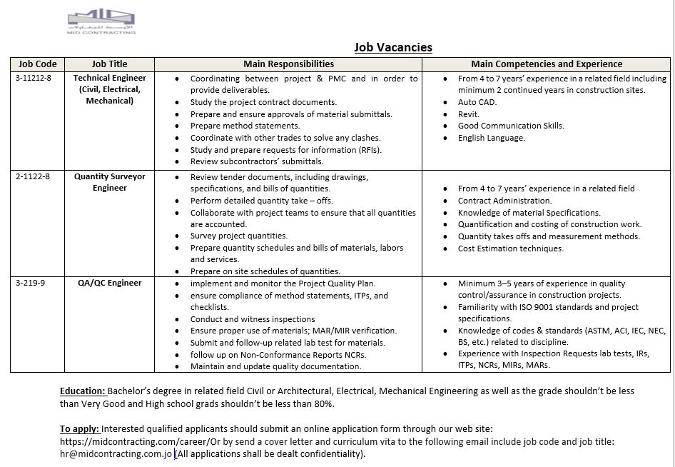 تُعلن شركة MID Contracting عن توفر فرص وظيفية مميزة في الأردن (عمان) ضمن عدد من التخصصات الهندسية، لأصحاب الخبرة والكفاءة في قطاع الإنشاءات.