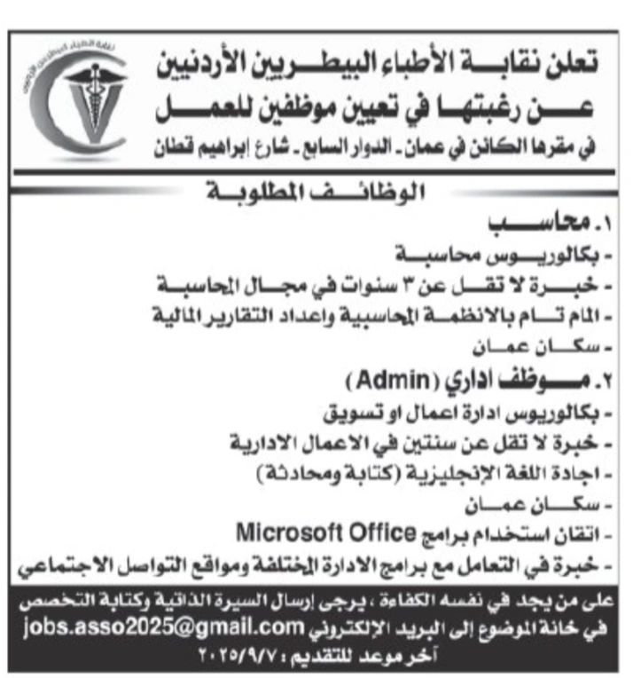 تعلن نقابة الأطباء البيطريين الأردنيين عن رغبتها في تعيين موظفين للعمل في مقرها الكائن في عمان – الدوار السابع – شارع إبراهيم قطان، وفق التفاصيل التالية: