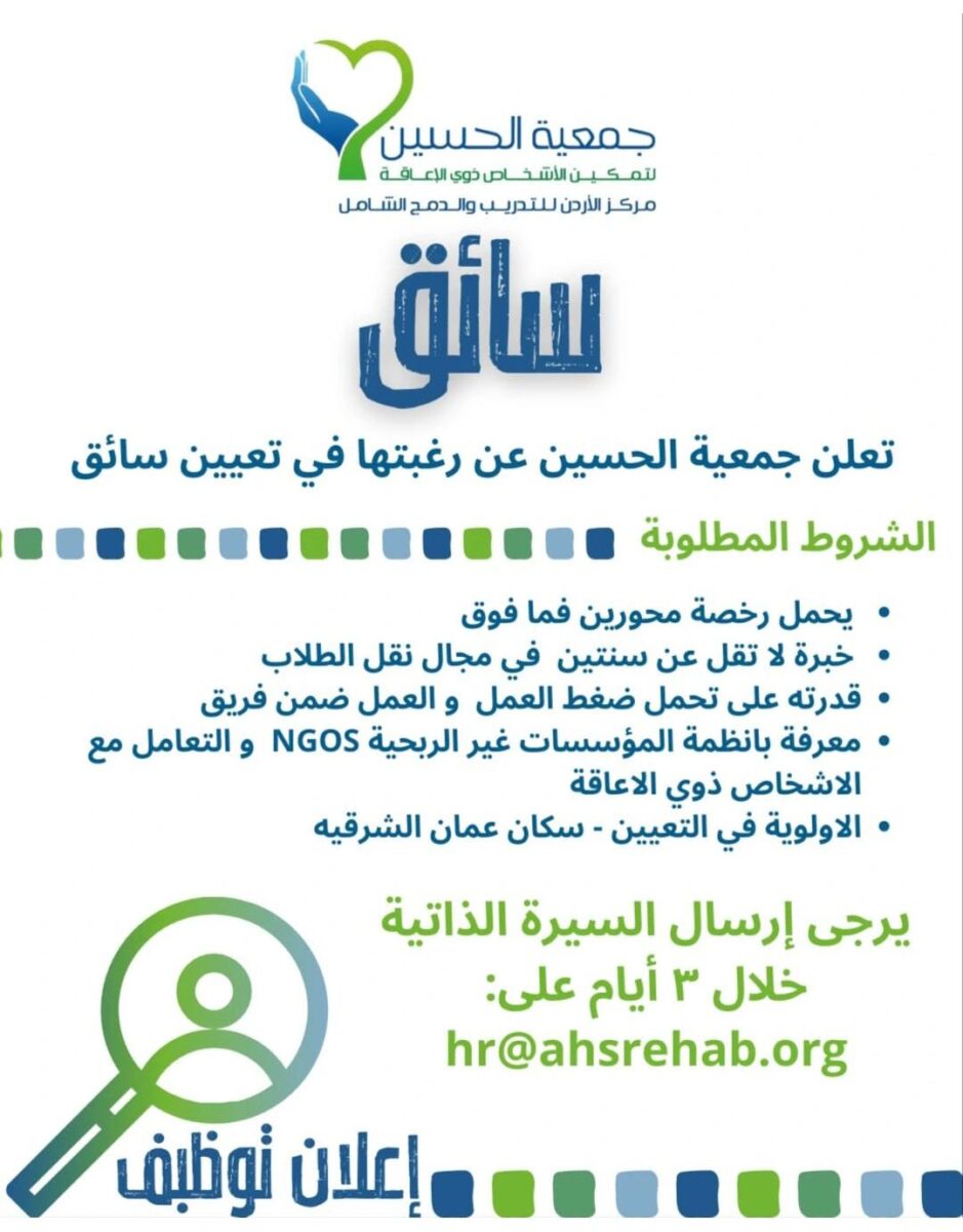 تعلن جمعية الحسين – مركز الأردن للتدريب والدمج الشامل عن رغبتها في تعيين سائق ضمن كوادرها.