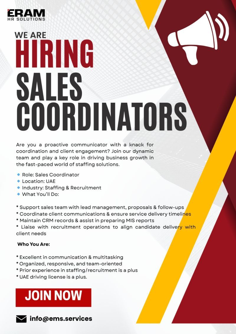 هل تبحث عن فرص عمل في دبي لعام 2025؟ انضم إلى فريق ERAM HR كمنسق مبيعات وكن جزءًا من فريق ديناميكي يساهم في نمو الأعمال في مجال التوظيف.