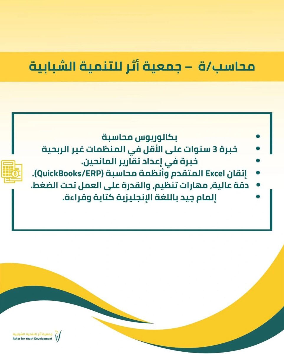 تُعلن جمعية أثر للتنمية الشبابية عن توفر شاغر لوظيفة محاسب/ة للعمل ضمن فريقها، وذلك ضمن المواصفات والمتطلبات التالية: