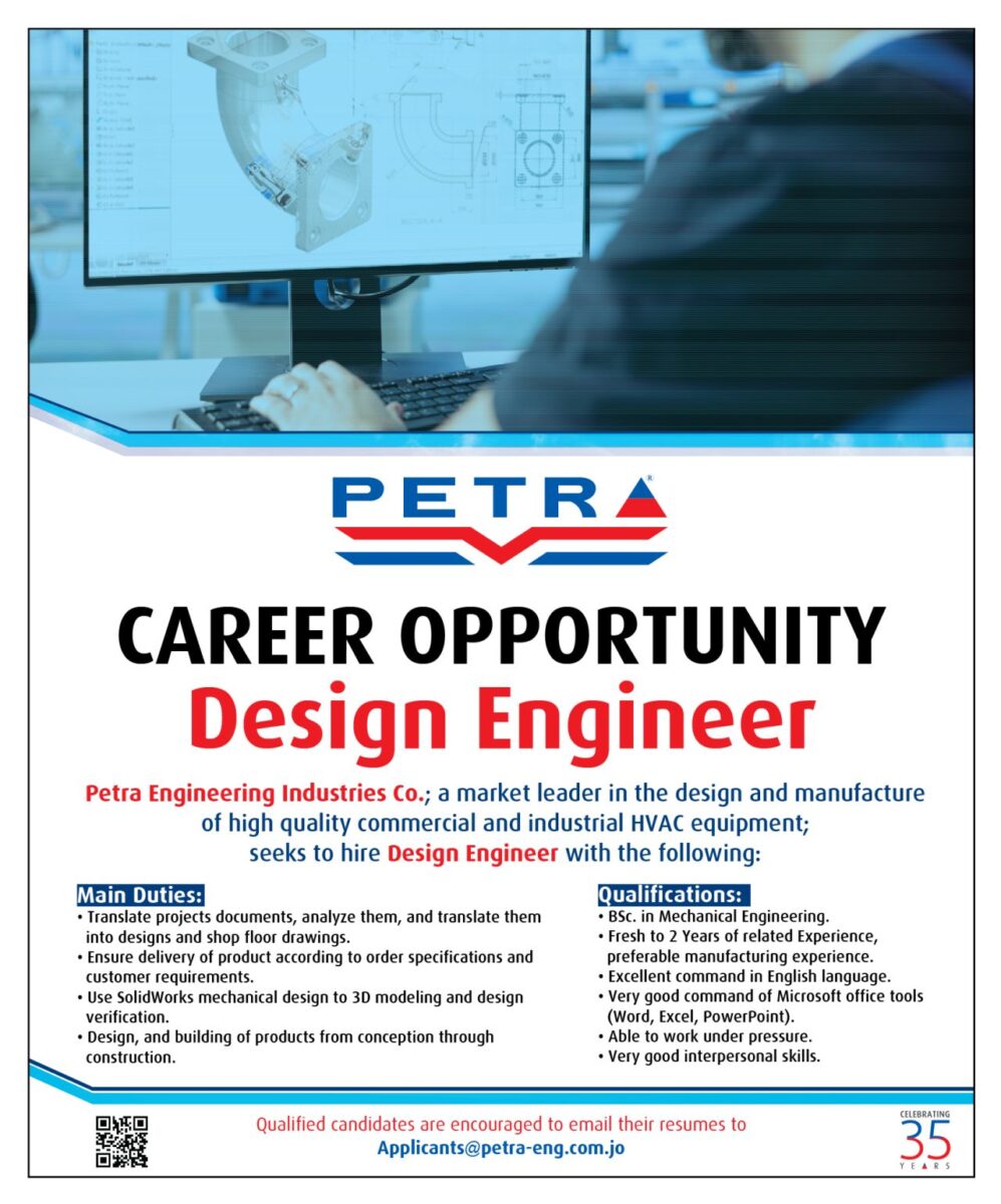 تعلن شركة بترا الهندسية، الشركة الرائدة في مجال تصميم وتصنيع معدات HVAC التجارية والصناعية، عن حاجتها لتوظيف مهندس تصميم للانضمام إلى فريقها. إذا كنت تمتلك خبرة في الهندسة الميكانيكية ولديك مهارات في تصميم المنتجات باستخدام SolidWorks، فإن هذه الفرصة قد تكون لك.