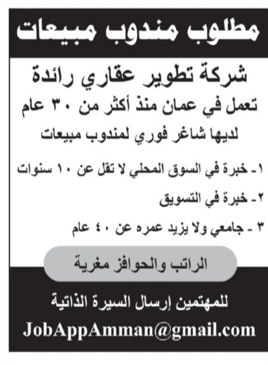 شركة تطوير عقاري رائدة في عمان تبحث عن مندوب مبيعات فوري، وفقًا للشروط التالية: