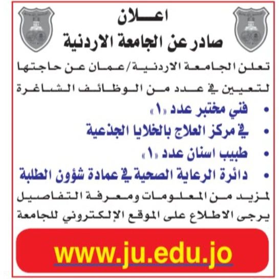 تعلن الجامعة الأردنية في عمان عن حاجتها لتعيين فني مختبر وطبيب أسنان، وذلك وفقًا للشروط التالية: