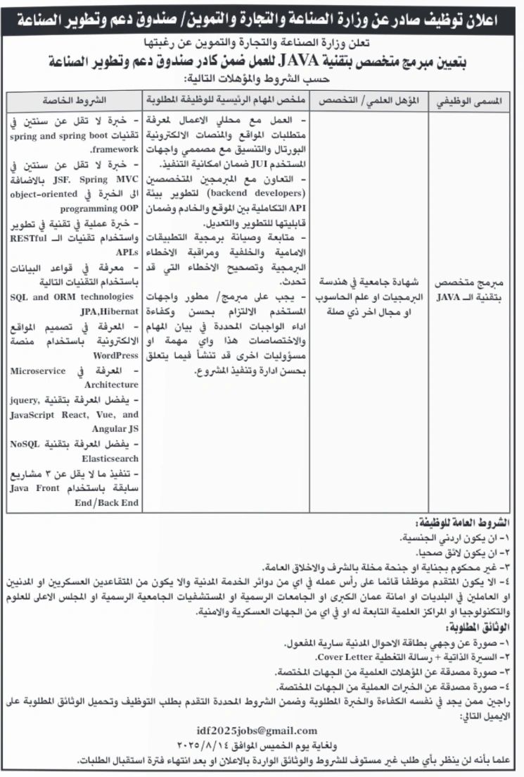 تعلن وزارة الصناعة والتجارة والتموين عن رغبتها في تعيين مبرمج متخصص بتقنية Java للعمل ضمن كادر صندوق دعم وتطوير الصناعة، وذلك وفقًا للشروط والمؤهلات التالية: