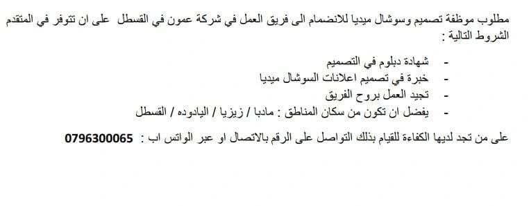 تُعلن شركة رائدة في منطقة القسطل عن رغبتها بتعيين موظفة تصميم وسوشال ميديا للانضمام إلى فريق العمل ضمن الشروط التالية: