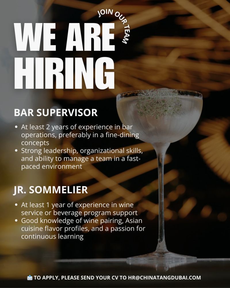 يعلن مطعم China Tang Dubai عن حاجته إلى تعيين كوادر متميزة في قسم المشروبات والضيافة للوظائف التالية: