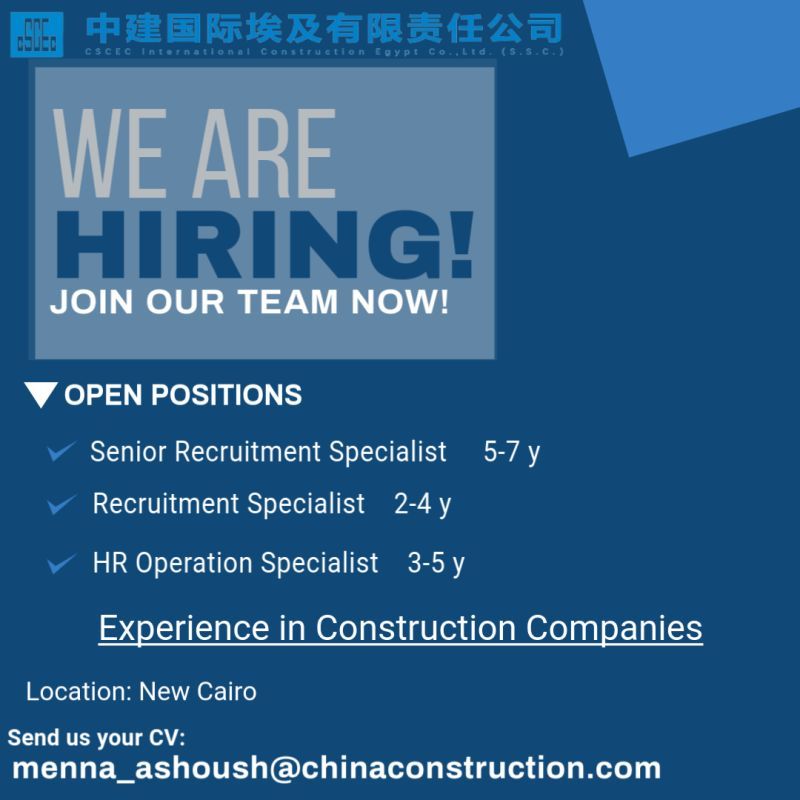 تُعلن شركة CSCEC International Construction Egypt عن فتح باب التقديم لوظائف شاغرة في قطاع الموارد البشرية بمقرها في القاهرة الجديدة، وذلك لمن لديهم خبرة سابقة في شركات المقاولات.