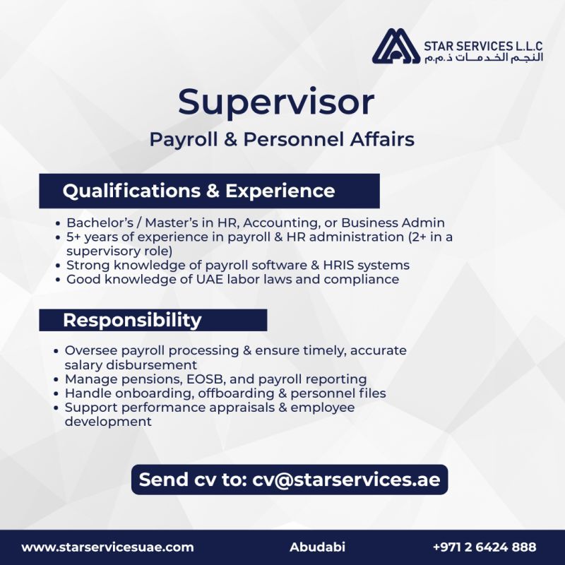 تعلن STAR SERVICES L.L.C عن فرصة عمل لوظيفة مشرف في مجال الرواتب والشؤون الإدارية في أبوظبي لسنة 2025.