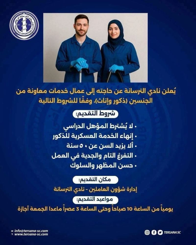 يعلن نادي الترسانة الرياضي عن حاجته إلى عمال خدمات معاونة (ذكور وإناث) للعمل في مقر النادي بالقاهرة.