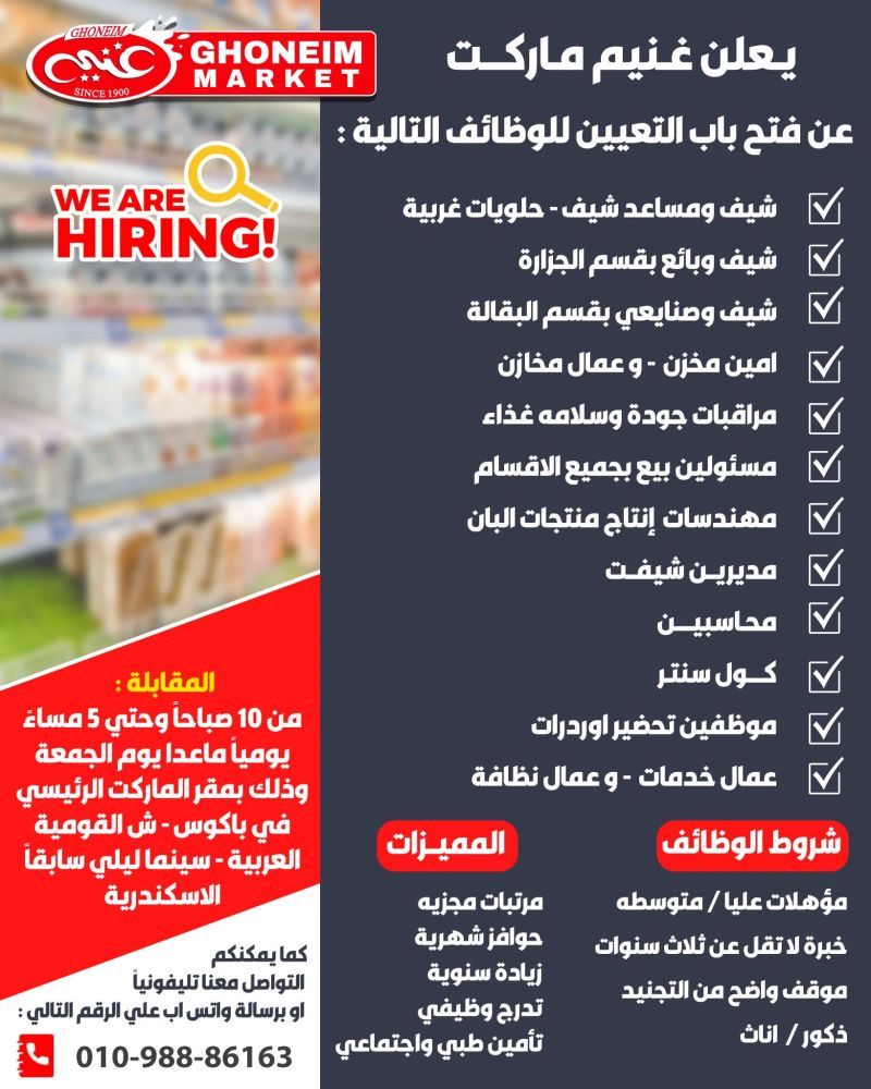 يعلن غنيم ماركت عن فتح باب التعيين لعدد كبير من الوظائف المتنوعة في مقره الرئيسي في الإسكندرية، لجميع المؤهلات والخبرات، للذكور والإناث.