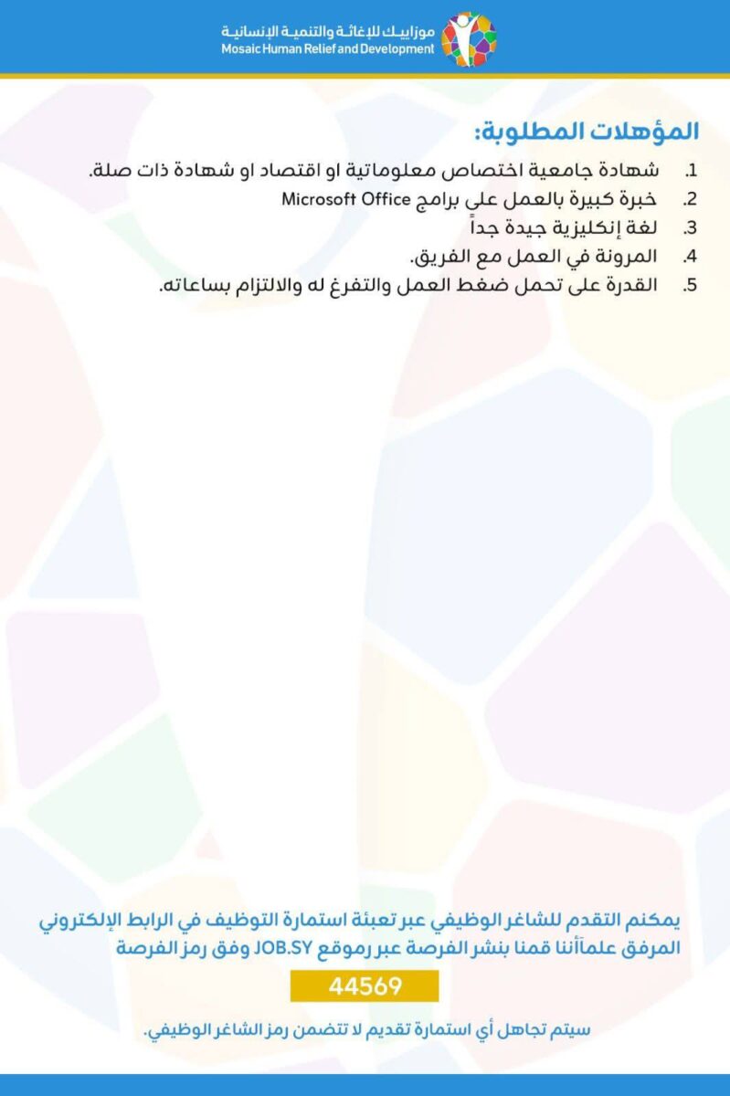 يعلن قسم الموارد البشرية في منظمة موزاييك عن توفر شاغر وظيفي بعنوان: مدخل بيانات للعمل في محافظة اللاذقية، وفق المهام والمتطلبات التالية: