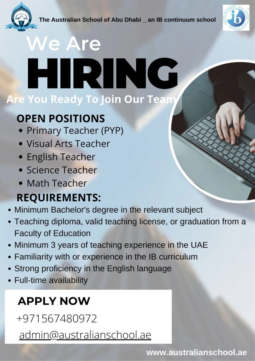 تعلن المدرسة الأسترالية في أبوظبي عن توفر وظائف تعليمية 2025 للكوادر التربوية المتميزة ضمن مناهج IB الدولية، وذلك للانضمام إلى فريق يسعى لبناء جيل مبدع وقيادي.