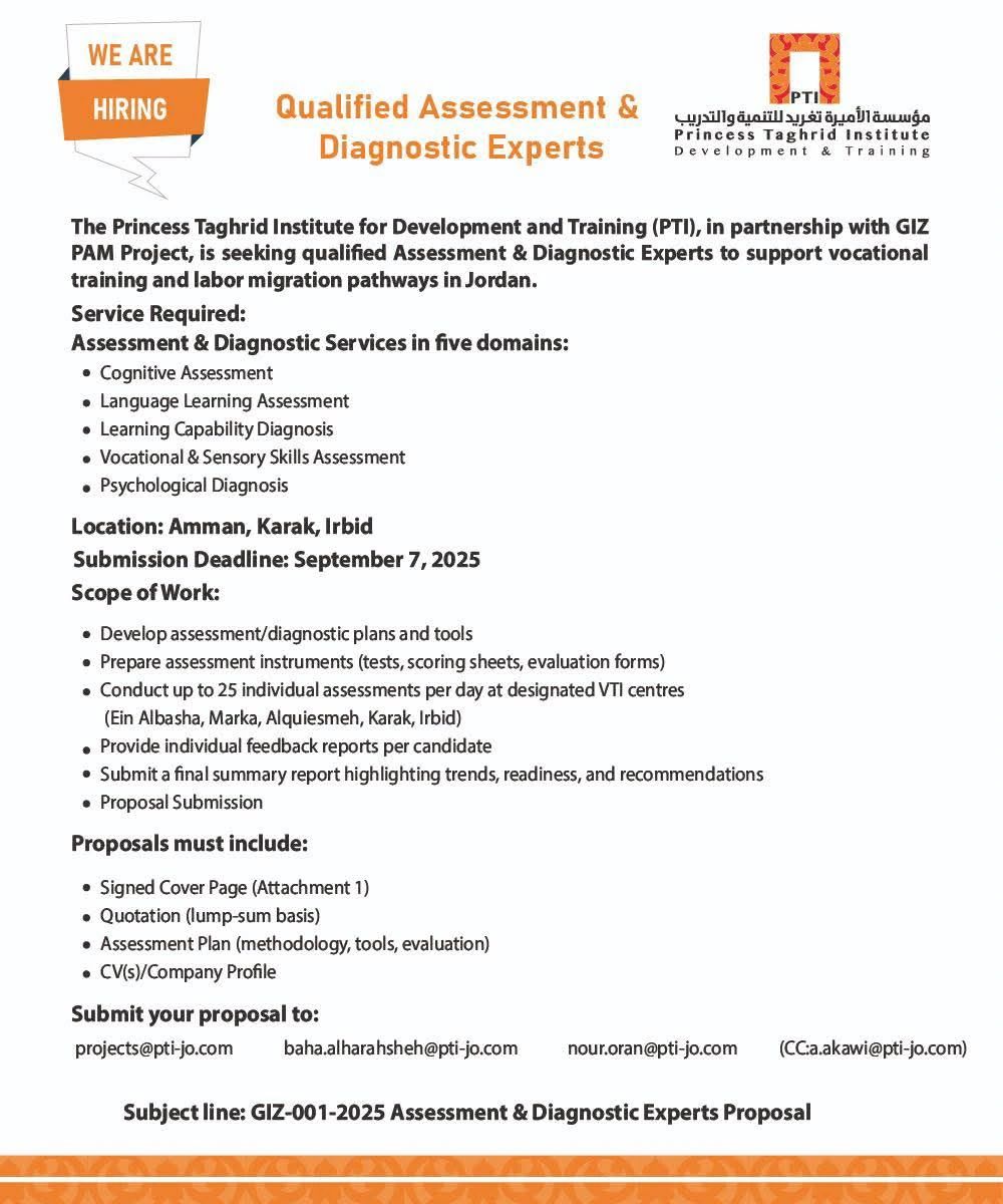 يعلن معهد الأميرة تغريد للتنمية والتدريب بالتعاون مع مشروع GIZ PAM عن حاجته إلى خبراء تقييم وتشخيص مؤهلين لدعم مسارات التدريب المهني والهجرة العمالية في الأردن.