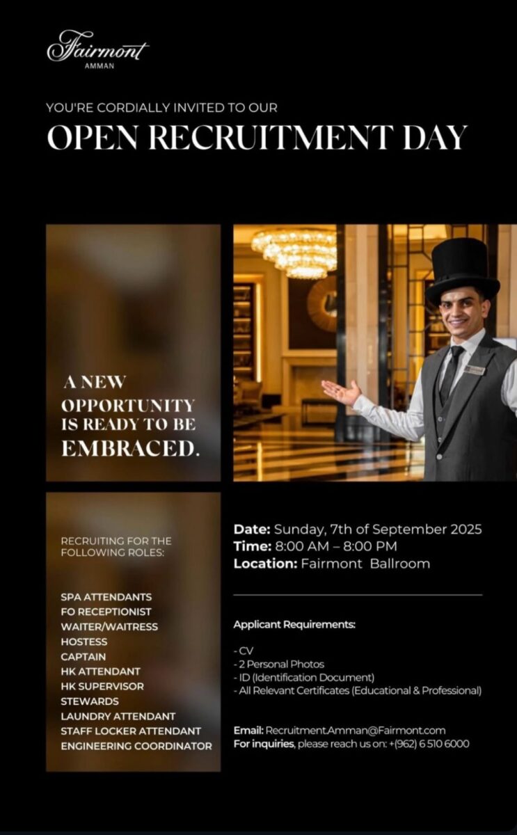 يسرّ فندق Fairmont Amman دعوة المهنيين الموهوبين لحضور يوم التوظيف المفتوح، والذي يُعد فرصة ممتازة للقاء فريق العمل، والتعرف على فرص العمل المتاحة، والمقابلة مباشرة في نفس اليوم.