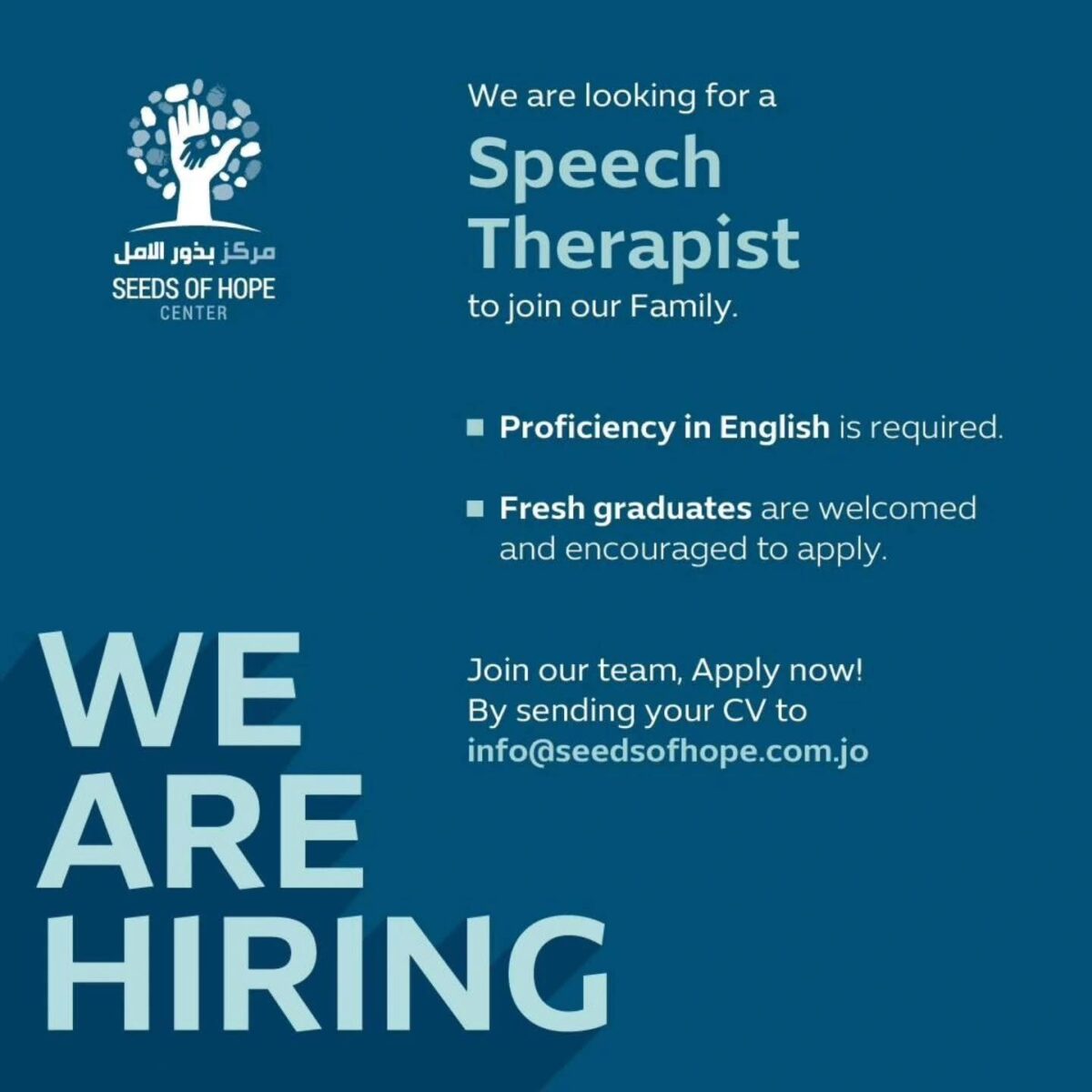 يعلن Seeds of Hope Center في العاصمة عمّان – الأردن عن حاجته إلى أخصائي/أخصائية نطق (Speech Therapist) للانضمام إلى فريقه المتميز.