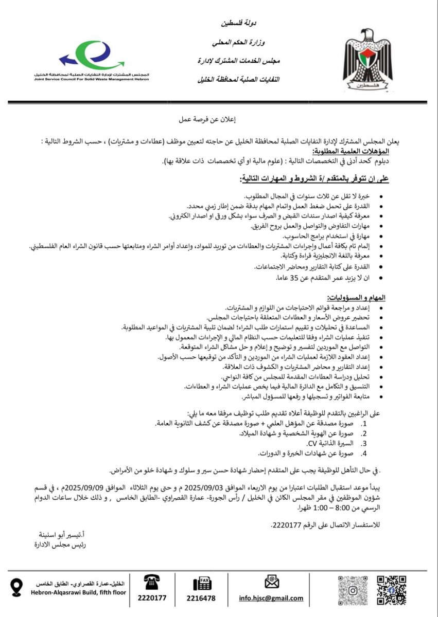 يعلن المجلس المشترك لإدارة النفايات الصلبة لمحافظة الخليل عن حاجته لتعيين موظف/ة عطاءات ومشتريات، وفقاً للتفاصيل التالية: