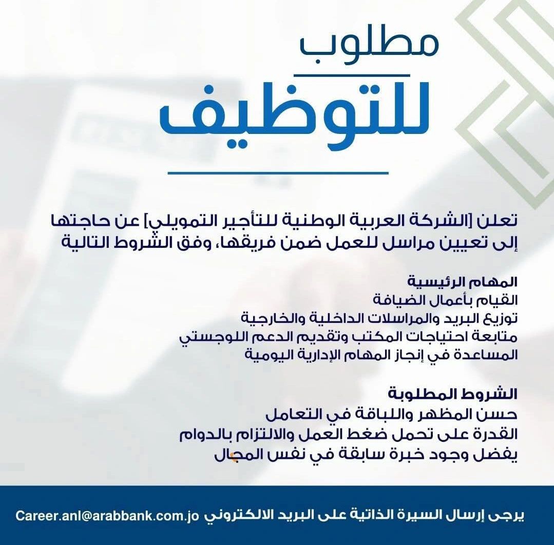 فرصة عمل في الأردن – وظيفة مراسل | الشركة العربية الوطنية للتأجير التمويلي