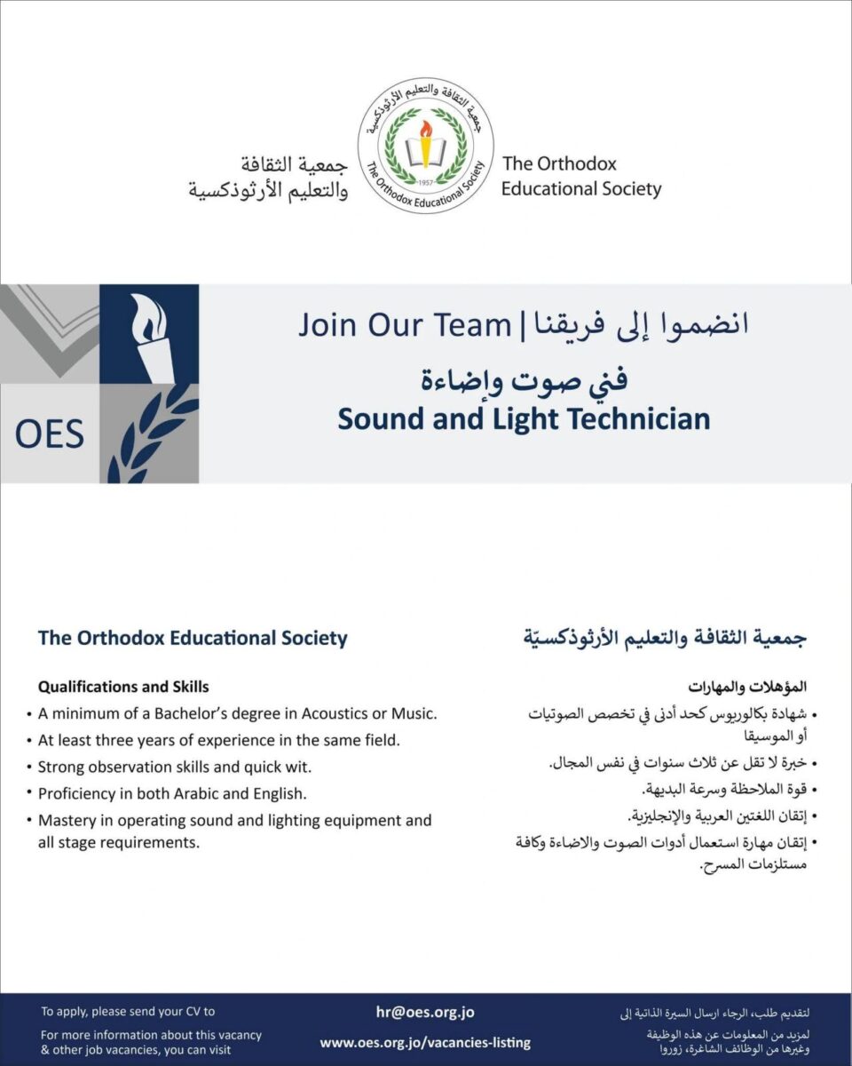 🎤 وظيفة شاغرة: فني صوت وإضاءة – The Orthodox Educational Society – الأردن (2025)